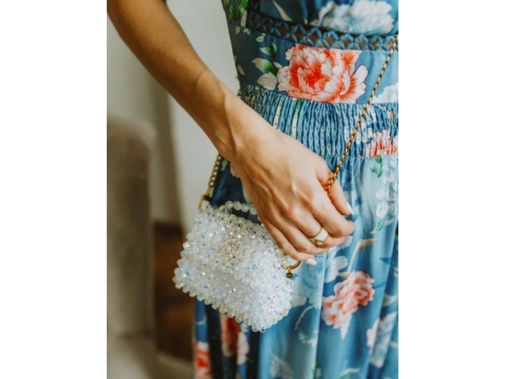 Ręcznie wykonana torebka wykonana z około 900 szlifowanych koralików Aurora (Crystal AB) podkreśli Twój styl.